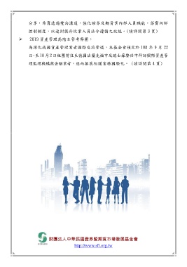 分享,希冀透過雙向溝通,強化證券及期貨業內部人員職能,落實內部 控制制度,以達到提升從業人員法令遵循之效能。(請詳閱第 3 頁) 2019 資產管理高階主管考察團: 為深化我國資產管理業者國際交流管道,本基金會預定於 108 年 9 月 22 日~至10月2日組團前往至德國法蘭克福市及瑞士蘇黎世市拜訪國際資產管 理監理機構與金融業者,進而推展相關業務國際化。 (請詳閱第 4 頁) 財團法人中華民國證券暨期貨市場發展基金會 http://www.sfi.org.tw