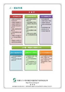 三、課程架構 財團法人中華民國證券暨期貨市場發展基金會 http://www.sfi.org.tw 第 30 頁 本冊課程內容僅供參考,實際開課之課程內容及收費標準以網路公告為準。